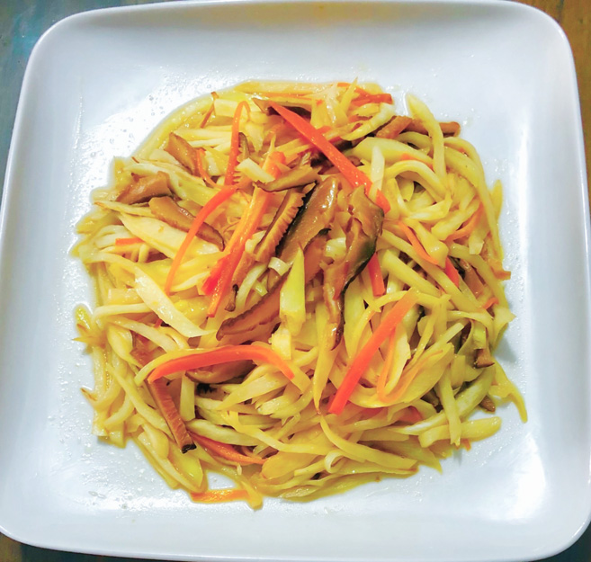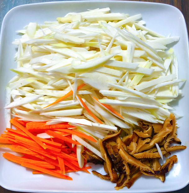 作法:茭白筍剝去外殻,斜切片再切成絲,紅蘿蔔切絲,香菇泡軟切絲,鍋內放適量油下香菇炒香+少許素毫油提味+紅蘿蔔、茭白筍+鹽炒軟+少許水燜熟即可。