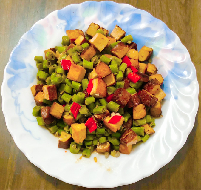 作法:先把長豆洗淨切丁川燙備用。豆乾切丁,薑切末,辣椒切丁。鍋內放油下薑末辣椒炒+豆干丁煎香+豆瓣醬、甜麵醬+少許素亳油+川燙好的長豆丁一起拌炒+少許水煮熟長豆即可。
