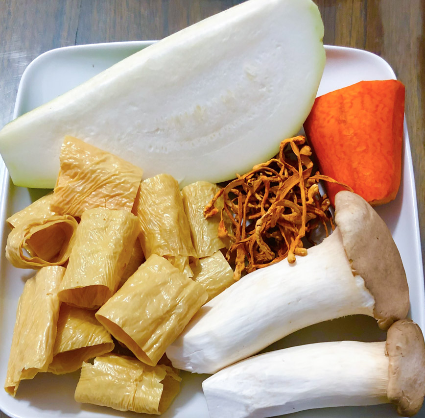 材料:瓠瓜、腐竹、紅蘿蔔、杏鮑菇、冬蟲夏草菇。