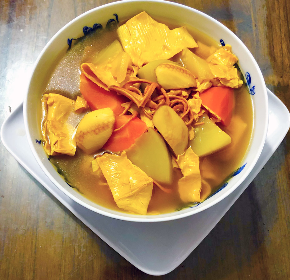 作法:先將所有食材洗淨,瓠瓜刨皮切滾刀,紅蘿蔔切小滾刀,腐竹、冬蟲菇先泡軟川燙備用,杏鮑菇切滾刀放入炒鍋中乾炒至香,再將所有食材倒入湯鍋中加水燉煮火開+鹽煮至瓜熟軟即可食用。