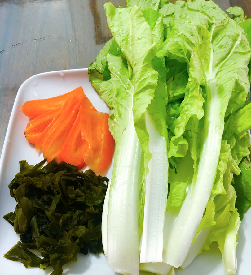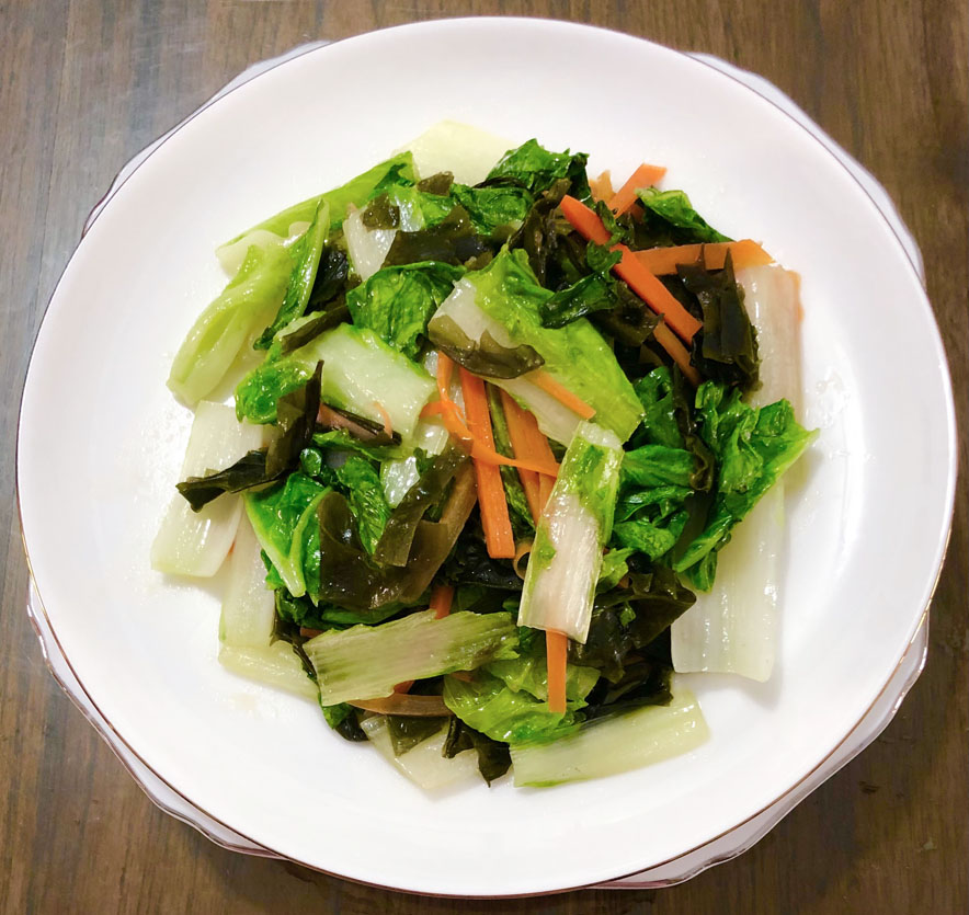 小白菜炒海帶芽 Posted on 2022-06-12 by malichuang 回應 材料:小白菜、海帶芽、紅蘿蔔。作法:先將小白菜洗淨切小段,紅蘿蔔切絲,海帶芽泡開洗淨,鍋內放油先下紅蘿蔔炒香+小白菜開大火拌炒+海帶芽+少許水+鹽一起翻炒均勻即可。