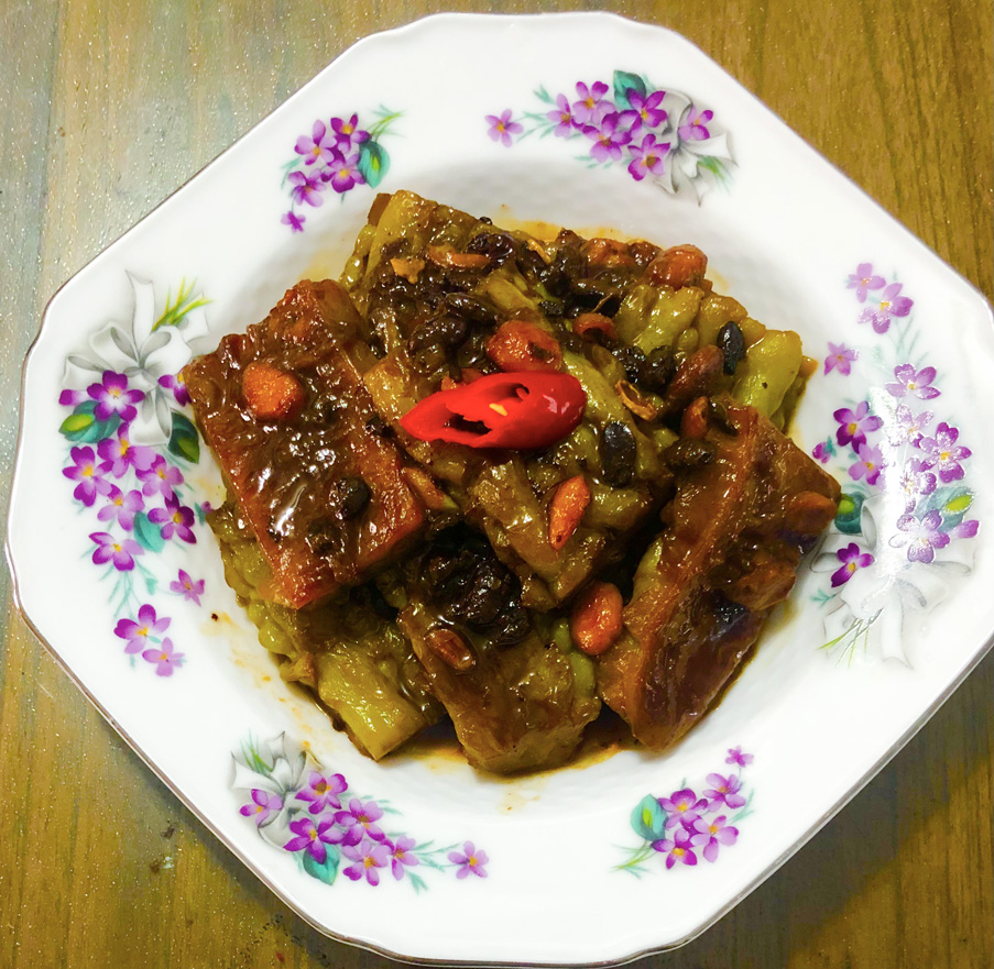 作法:苦瓜切片 (連子),鍋內放稍多些油將苦瓜放入鍋中兩面煎香盛起,鍋尚有油下豆鼓煎香+甜麵醬+素毫油炒香倒入煎好的苦瓜+水蓋鍋蓋小火燜煮至苦瓜入味熟軟即可。