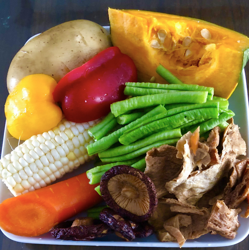 材料:南瓜、馬鈴薯、玉米、長豆、香菇、皮絲、彩椒、紅蘿蔔、醬油、素毫油、冰糖。