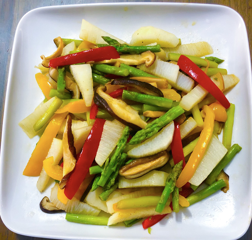 作法:先把山藥刮去皮切條泡水 (加點鹽泡山藥不會變黑),川燙時+鹽撈出備用,蘆筍刮去粗皮洗淨切段,彩椒切細條均川燙備用。鍋內放油下香菇炒香+胡椒鹽拌炒+薄醬油爆香+川燙好的蘆筍及彩椒山藥一起翻炒加少許水煮入味即可。