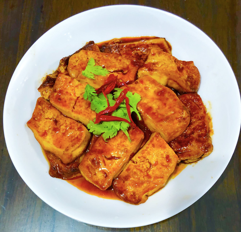 作法:先將豆腐洗好,抹上少許鹽備用。鍋內放多些油將切腐切片下鍋煎兩面金黃+少許素毫油爆香+番茄醬+甜辣醬+適量水煮入味即可盛起排盤。