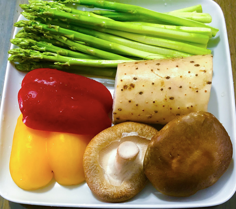 材料:蘆筍、山藥、紅黃彩椒、香菇。