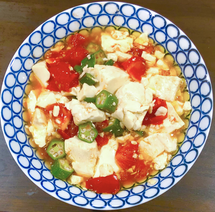 作法:將番茄、秋葵洗淨,番茄加切丁、秋葵切小片、嫩豆腐切大方塊。鍋內放下番茄炒出汁+秋葵拌炒+玫瑰鹽+嫩豆腐煮透輕輕翻炒+亞麻仁油撒上胡椒鹽即可。