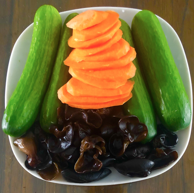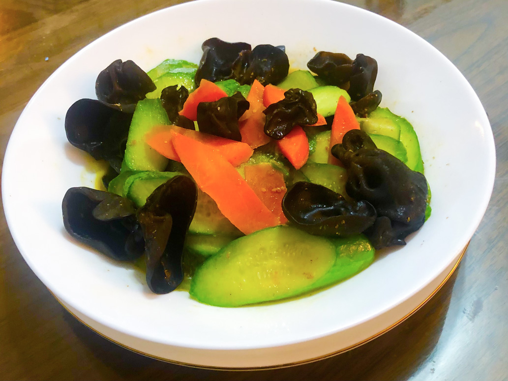 材料:小黃瓜、木耳、紅蘿蔔、沙茶醬、素毫油。