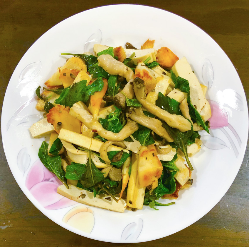 作法:先將美人菇川燙稍擠水備用。九層塔洗淨備用,豆干切片,猴頭菇切片,鍋內放油下猴頭菇煎香+豆干稍黃後盛起,鍋內放少許油下美人菇炒香+胡椒鹽拌炒+炒好的猴頭菇和乾豆+素毫油+九層塔翻炒入香即可。