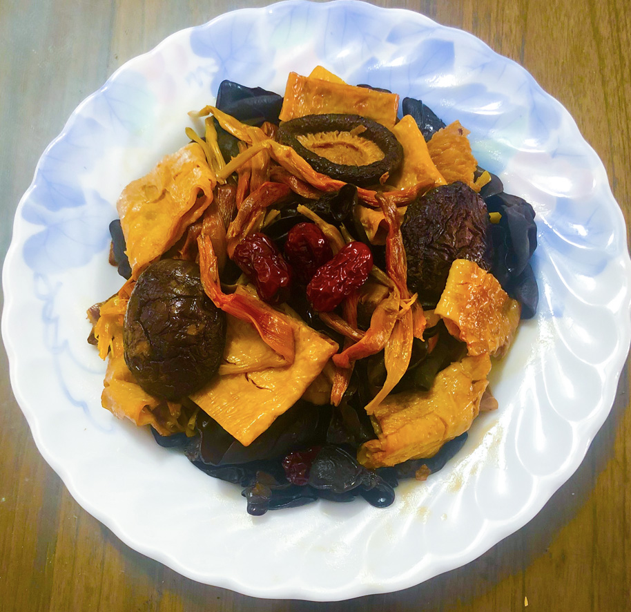 作法:先將腐竹、木耳、香菇、金針用水泡開,燒開一鍋水,將泡開的食材除香菇紅棗外其他一一放入鍋中川燙煮滾撈出備用。另一鍋內放油下香菇煎香+冰糖炒香+腐竹+金針、木耳、紅棗+素毫油爆香+胡椒鹽一起翻炒+水適量燉煮至熟軟即可。