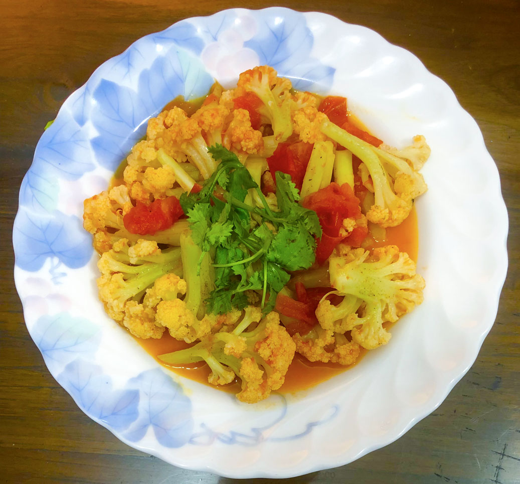作法:先将白花椰菜的硬梗削去,切成小朵,番茄切片,鍋内放油下番茄炒香+白花椰菜+鹽+兩滴素毫油提味一起拌炒+少許水燜煮至白花椰菜入味,撒點香菜在上面配色即可盛起。