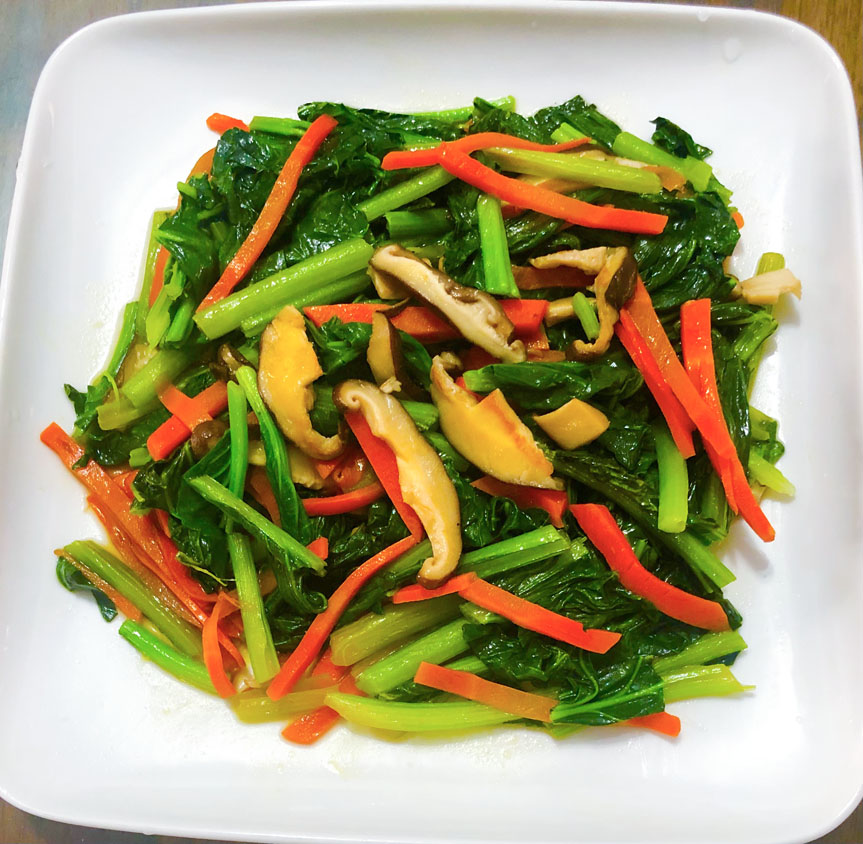 作法:先將油菜泡水洗淨切段備用。紅蘿蔔切絲,生香菇切片,鍋內放油下香菇紅蘿蔔炒出香味+鹽+少許素毫油+油菜梗炒軟,再+葉子+少許水炒入味即可。
