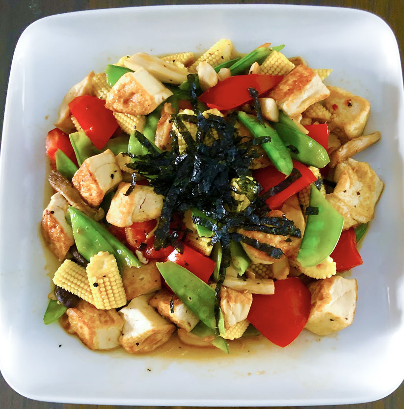 作法:先將所有食材洗淨,生香菇、杏鮑菇撕小片,番茄切片再對切,玉米筍切三段,荷蘭豆對切,豆腐切大丁塊,煮一鍋滾水將所有材料川燙備用。鍋內放油把菇稍擠乾水下鍋煎香放一旁,下豆腐煎香+鹽拌炒後+所有食材+粗黑胡椒粒+橄欖油+和風醬油+素食烏醋一起小火拌勻即可起鍋,裝盤上面用小紫菜煎細條撒上出桌。