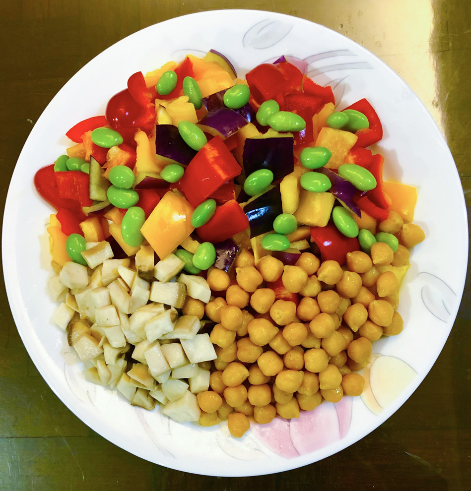 材料:鷹嘴豆、杏鮑菇、三色彩椒、毛豆。