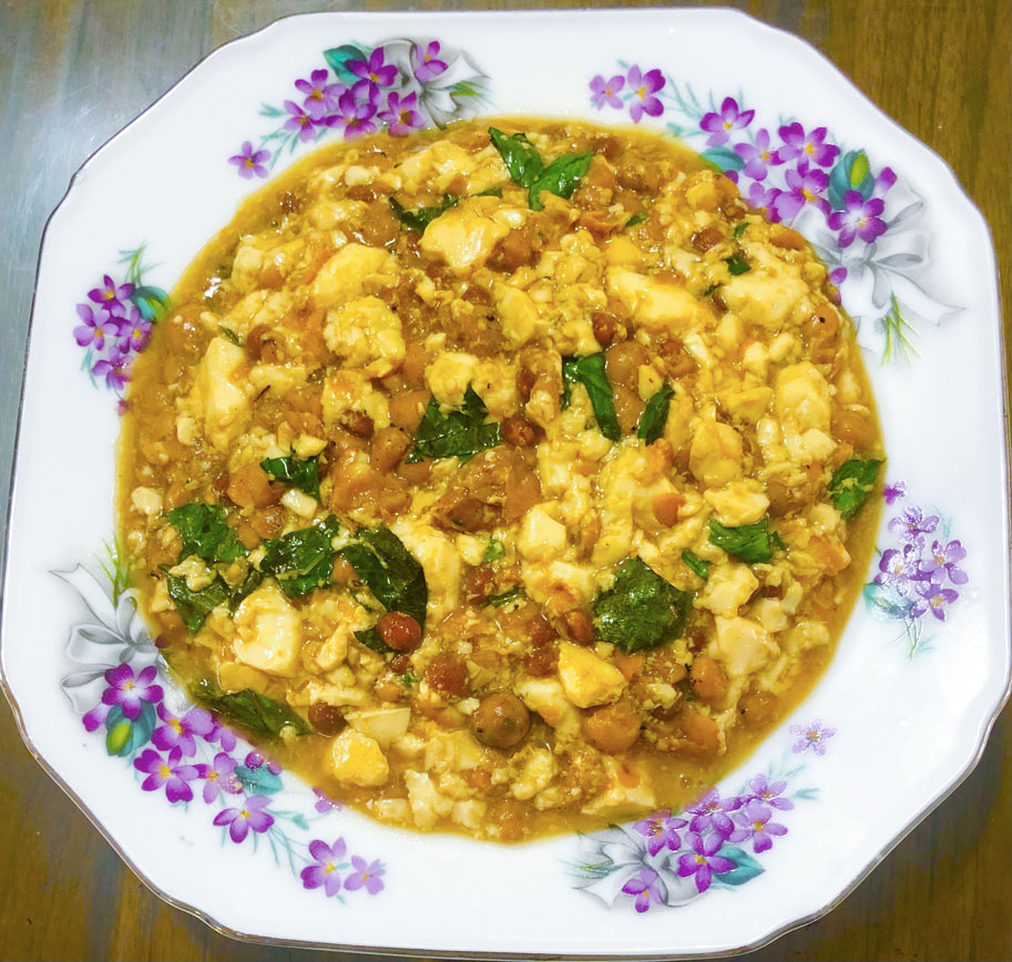 作法:鍋內放油下破布子剝開煎香,再倒入豆腐壓碎+少許素亳油把破布子和豆腐拌勻煮熟+九層塔拌炒後盛起裝盤即可。