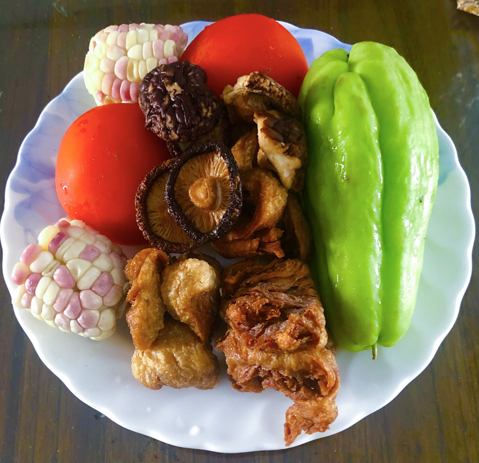 作法:先將佛手瓜刮去皮切滾刀塊,番茄切大丁塊,香菇整粒泡開不切,圓球麵筋撕片,玉米切塊狀。鍋內放油下沙茶+豆瓣醬炒香+素毫油拌炒+香菇+番茄翻炒+多些火煮沸+圓球麵筋燉至番茄爤+佛手瓜+糖+鹽一起關小火燉至佛手瓜熟即可。