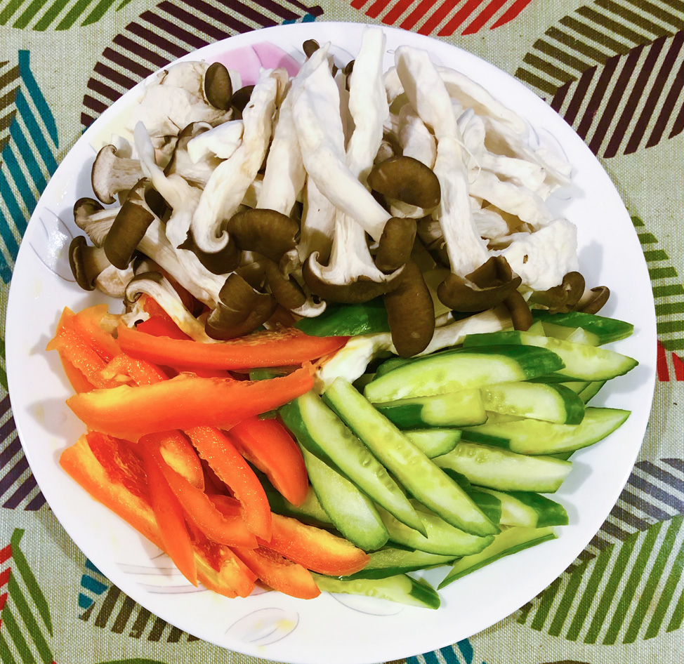材料:霜降黑蠔菇、小黃瓜、橘色彩椒、沙茶醬、醬油、素毫油。
