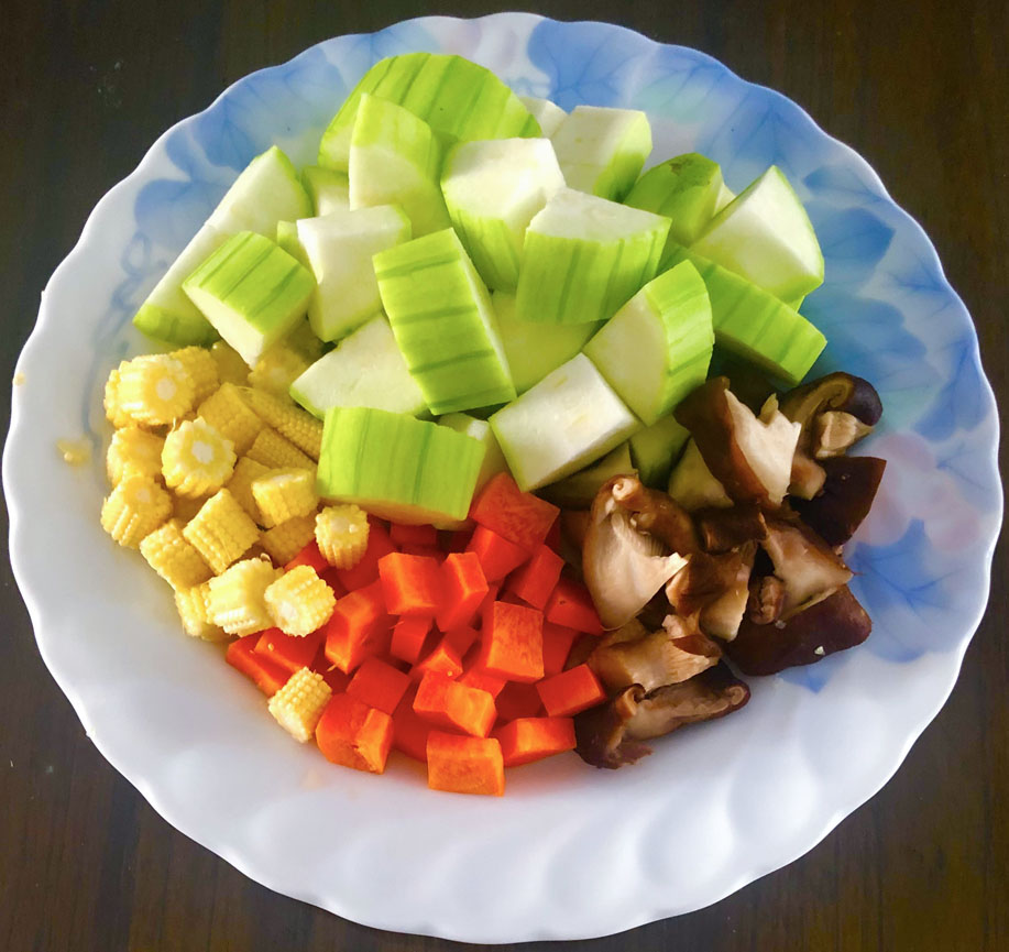 材料:絲瓜、紅蘿蔔、玉米筍、香菇。