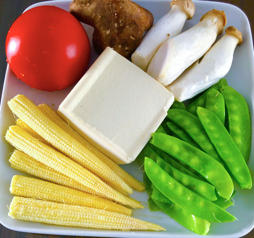 材料:豆腐、生香菇、杏鮑菇、玉米筍、荷蘭豆、番茄。
