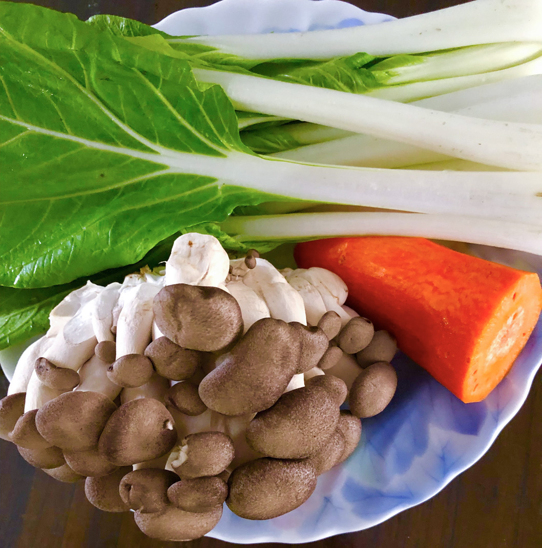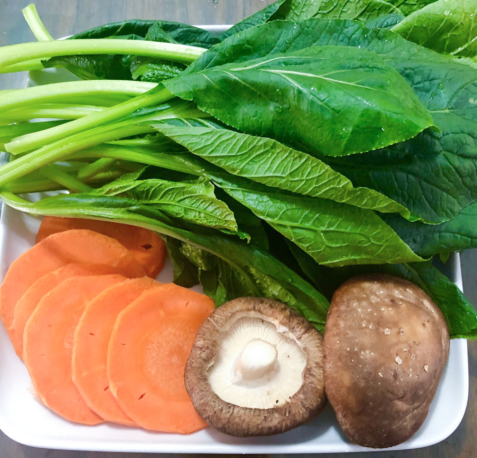 材料:黑葉小白菜、小松菜 (油菜小的)、紅黃彩椒、杏鮑菇、黑美人菇、豆包、豆包丸、橄欖油、素食烏醋、白胡椒鹽、粗粒黑胡椒、和風醬油、鹽、糖、檸檬汁。