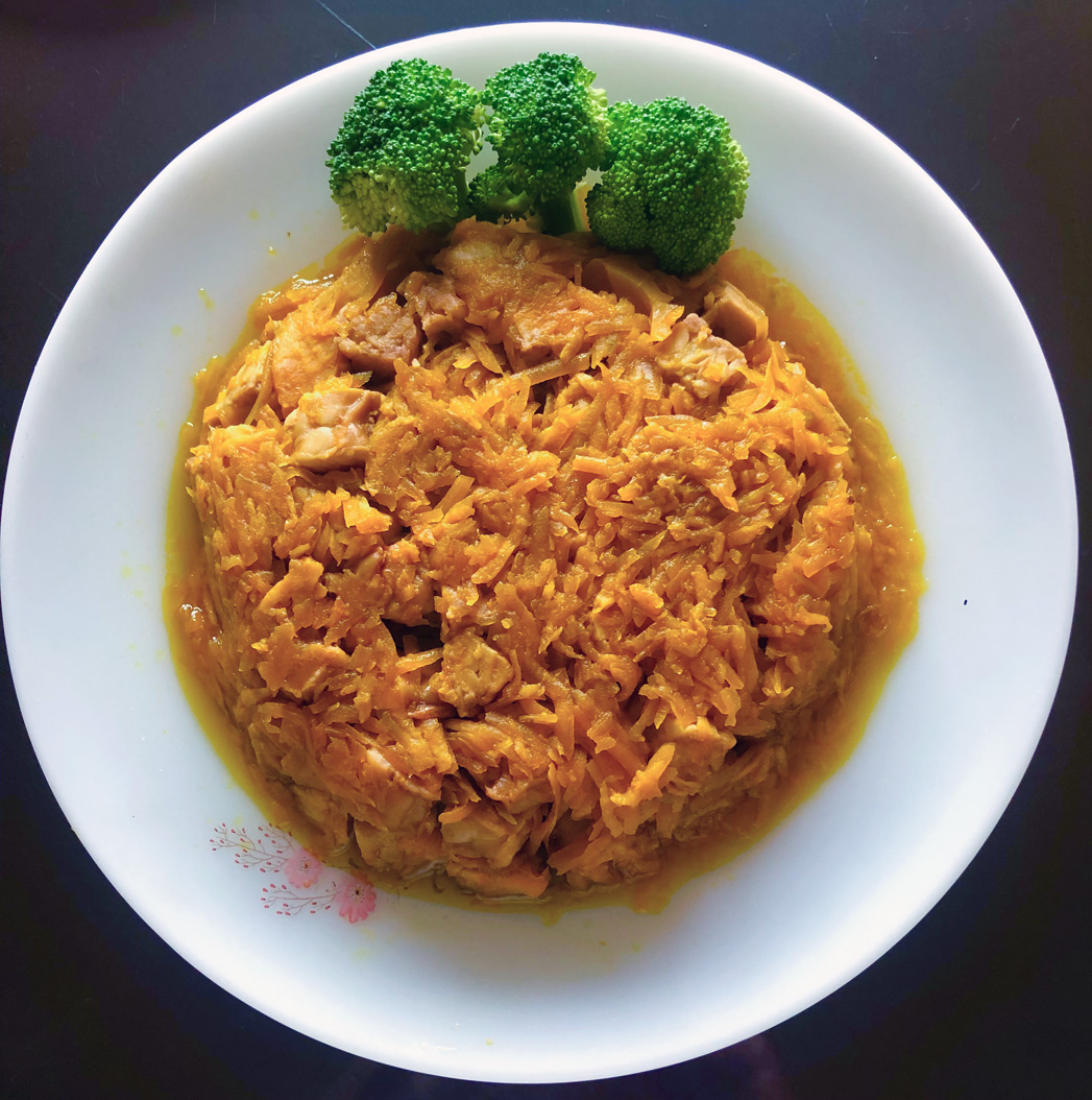 作法:先將南瓜刮皮刨絲備用,再將天貝切丁,鍋內放油下天貝煎到兩面金黃盛起。鍋內再放油下南瓜絲炒軟,再將炒好的天貝倒入一起拌炒+少許素毫油+鹽+少許水再拌炒均勻盛入大碗中蒸 20 分鐘 (大碗先抹油)。取出後倒扣在盤中,將多餘的湯汁勾欠淋上即可。