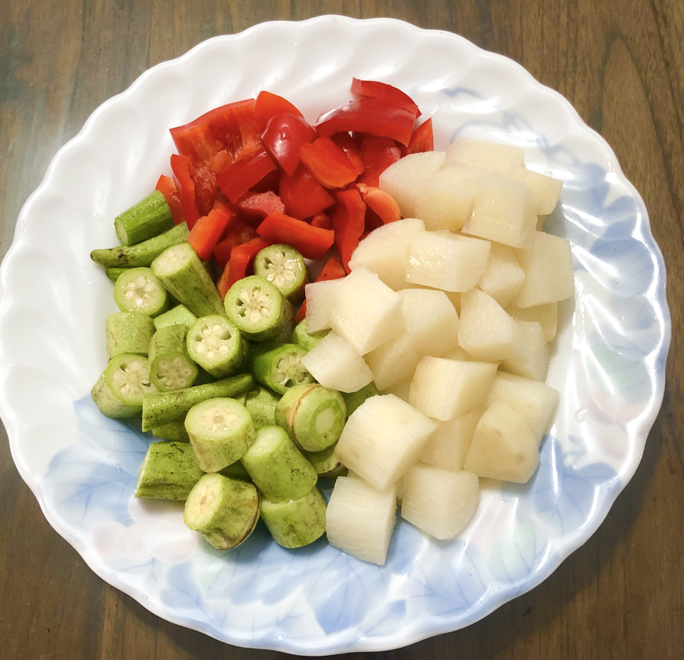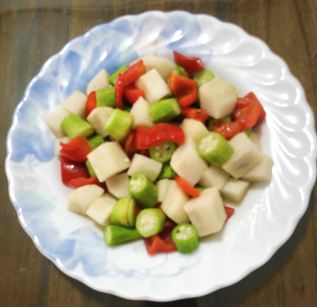 作法:先把山藥在水龍頭下一邊沖水一邊刮皮 (這樣手才不會癢),刮皮刮好切成大丁塊泡鹽水 (才不會氧化變黑),秋葵切小塊,紅椒切大丁塊,全部先川燙一次,山藥可以煮稍熟後再撈起,鍋內放橄欖油將所有食材倒入鍋中鹽+胡椒粉炒入味即可盛起。