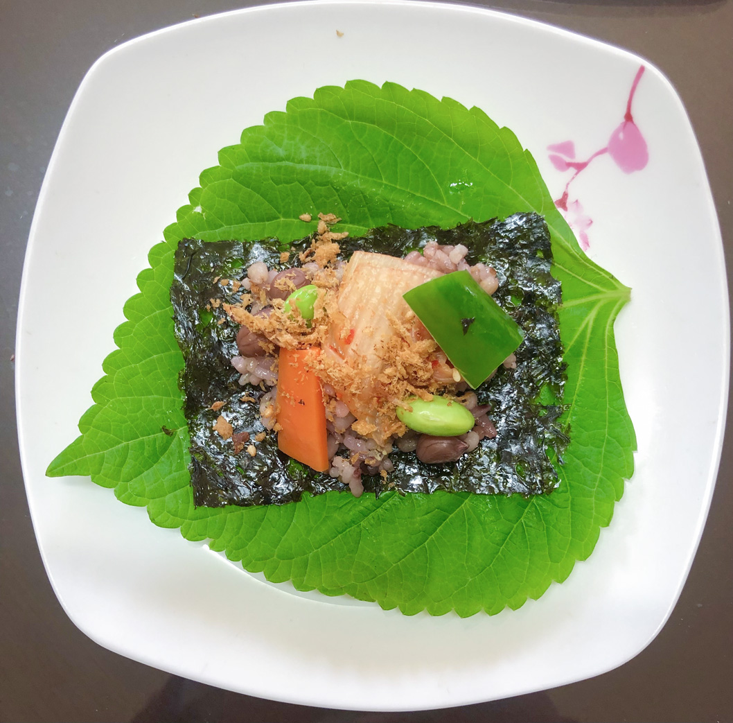 作法:毛豆、花生、紅蘿蔔燙熟之外,其他都是現成的,芝麻葉就包飯吃了。在韓國偶爾學吃點韓國料理,紫菜包飯就是有什麼就吃什麼。