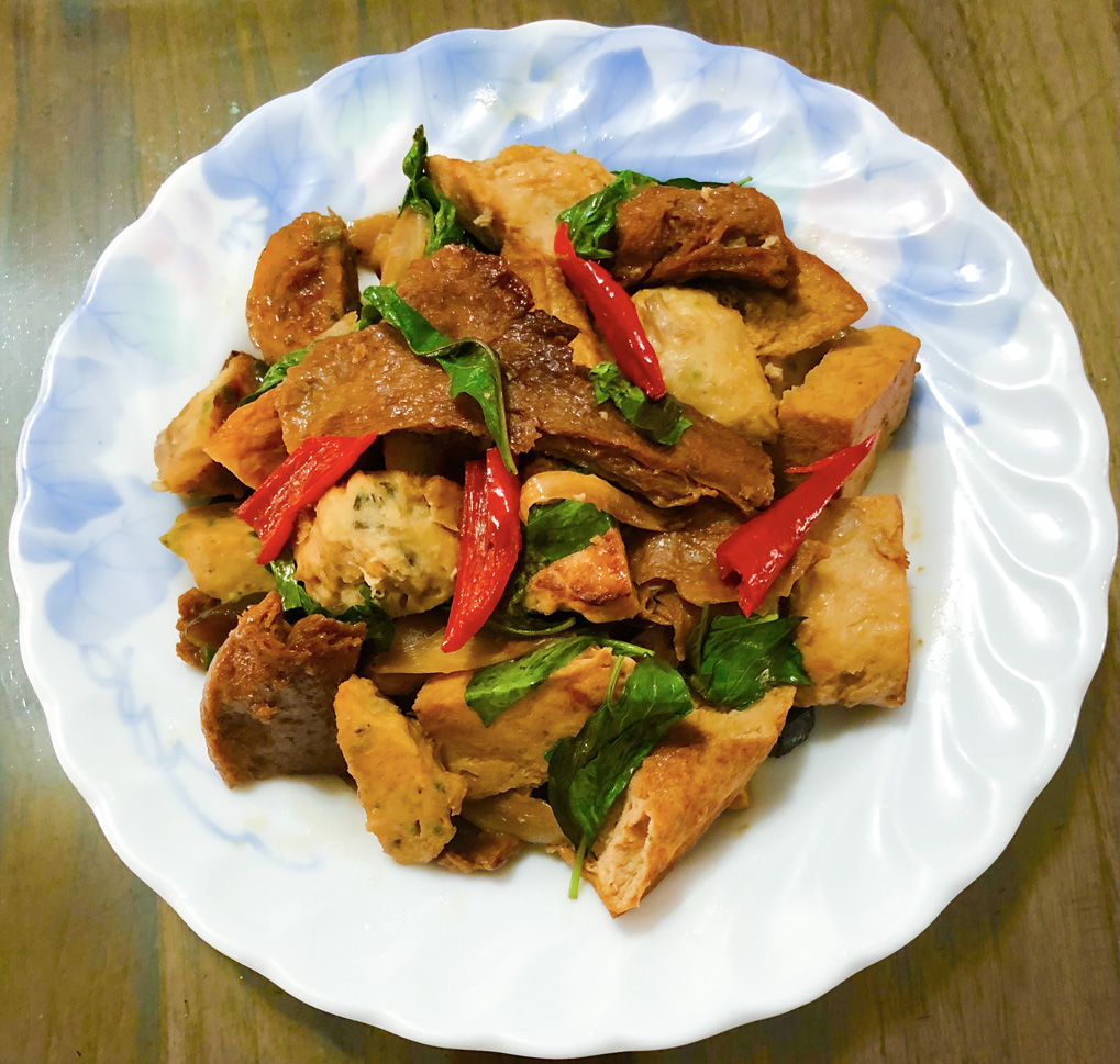 作法:皮絲泡軟撕片,油豆腐對切成三角形,素菜丸子切四片,九層塔洗淨備用。鍋內放油少許冰糖融化後倒入皮絲炒出顏色+紅辣椒+薑片+所有素材+素毫油+料酒拌炒+少許水燉煮入味+九層塔翻炒即可起鍋了!