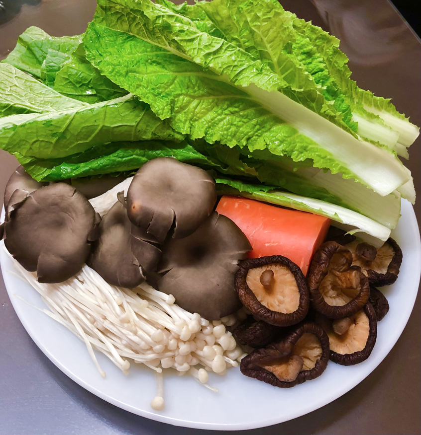 材料:麵線、小白菜、紅蘿蔔、香菇、長腿菇、金針菇、芡粉。