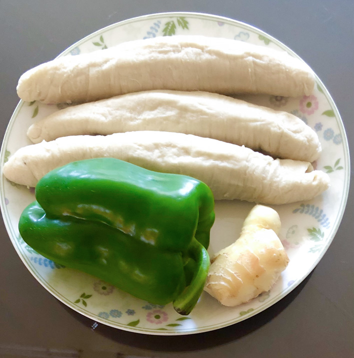 材料:麵腸、青椒薑絲、胡椒鹽、醬油、香油。