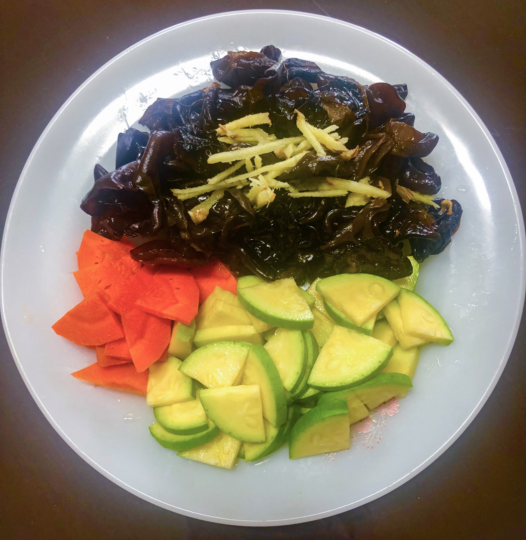 材料:木耳、櫛瓜、紅蘿蔔、薑。