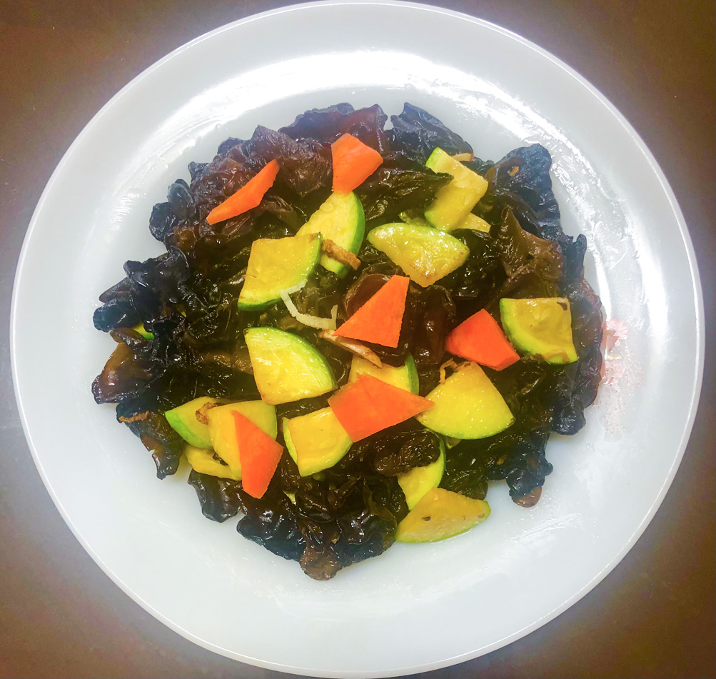 作法:先將木耳洗淨燙熟撈起備用,櫛瓜和紅蘿蔔切片,鍋內放油下薑+紅蘿蔔木耳炒香+醬油爆香+櫛瓜一起翻炒至熟即可。