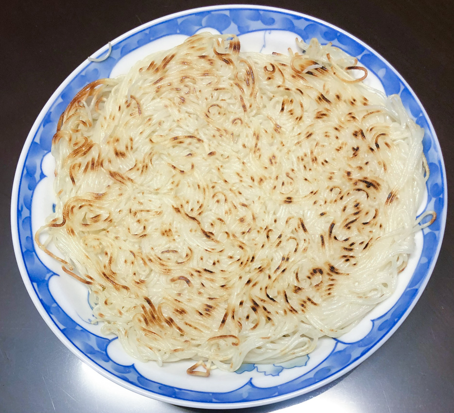 作法:先將麵線燙熟撈出,鍋內放油將燙熟的麵線倒入鍋中煎成兩面金黃色盛起備用。