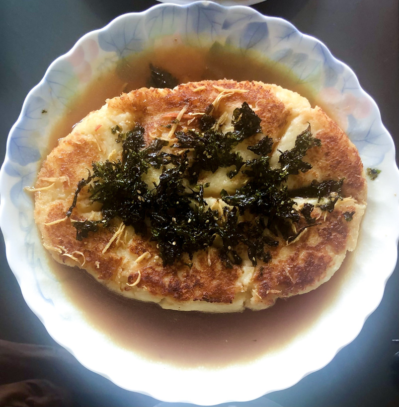 作法:馬鈴薯去皮切片放入電鍋中蒸熟後取出,撒上些許麵粉+些許鹽攪拌壓扁成素魚狀,鍋內放油放下馬鈴薯素魚餅,煎成兩面金黃色後盛起,鍋內放油下薑絲炒香+少許醬油+芡粉水煮滾,再淋在煎好的素魚上+撒上撕碎的紫菜即可。