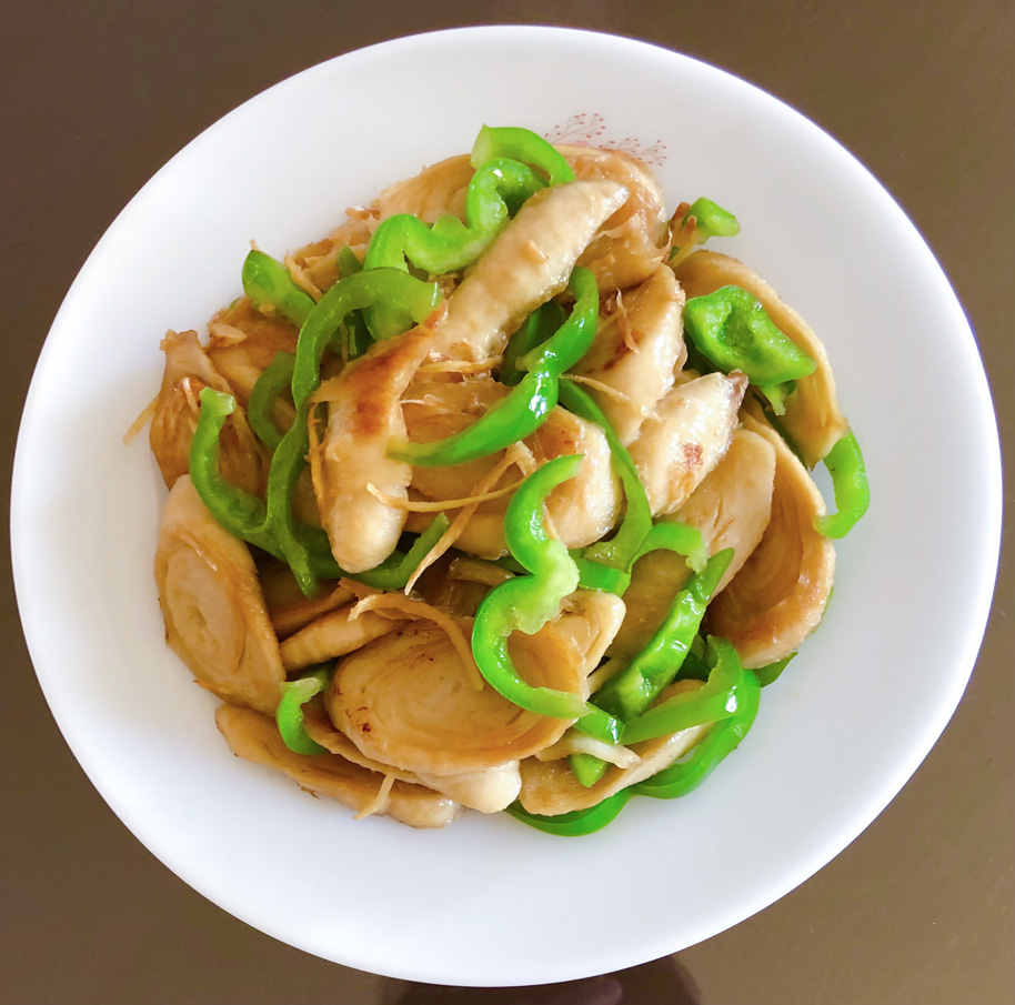 作法:麵腸切斜片,青椒切絲,薑絲切絲,鍋內放油下薑絲炒香+麵腸煎兩面稍黃+醬油爆香+青椒+胡椒鹽拌炒+香油翻炒即可。