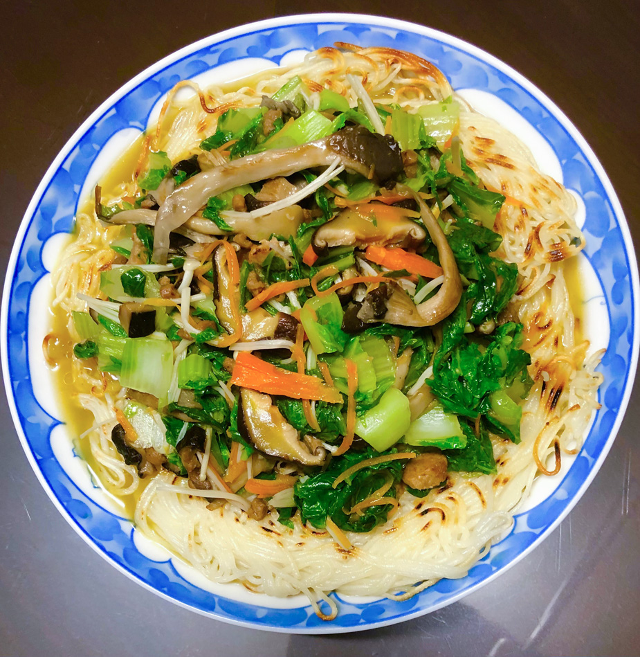 再將小白菜洗淨切小段,紅蘿蔔切𢇁長腿菇撕條,香菇切絲,鍋內放油下香菇煎香 (煎香菇放少許鹽讓香菇入味)+長腿菇+紅蘿蔔一起炒香+小白菜+金針菇+少許鹽拌炒均勻+芡汁+少許水煮滾,將炒好的料倒入煎好的麵線即可食用。