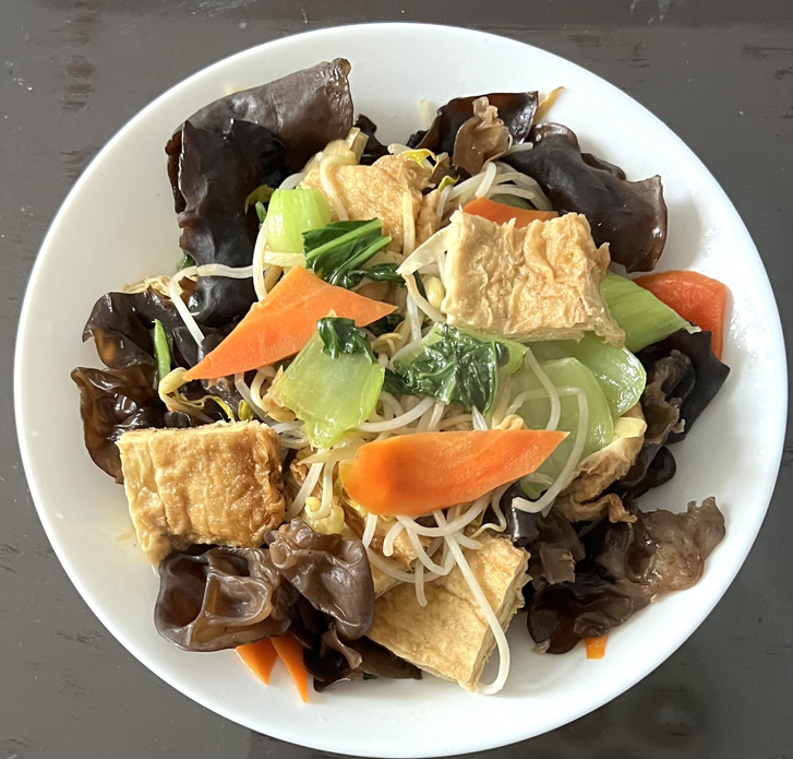 作法:木耳泡開川燙備用,豆包煎兩面黃切成六片、豆芽摘尾,紅蘿蔔切片,青江菜切小段。鍋內放油紅蘿蔔青江菜下鍋拌炒+木耳+豆包+少許素毫油+少許鹽拌炒+少許水+豆芽一起拌炒至熟盛起。