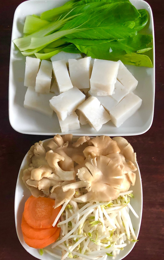 材料:麵線、小白菜、紅蘿蔔、香菇、長腿菇、金針菇、芡粉。