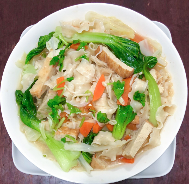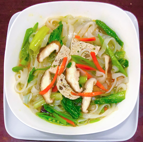 作法:把蔬菜洗淨切小段,紅蘿蔔切絲,蔬菜丸切片,生香菇切片。鍋內放油先下紅蘿蔔絲炒香+生香菇炒+蔬菜丸+蔬菜+水煮滾下粿條煮+胡椒鹽+香菜即可。喜歡辣可加辣椒醬或豆瓣醬提味。