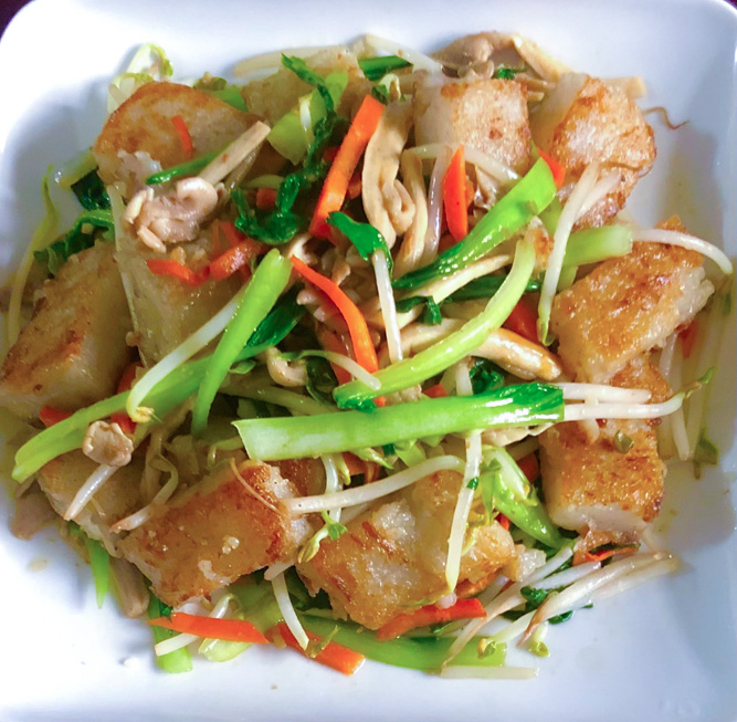 作法:將蘿蔔糕切小塊,鍋內放油煎兩面黃剩起備用。青江菜紅蘿蔔切細條,豆芽去尾鬚,鍋內尚有煮糕剩的油下紅蘿蔔絲炒軟+青江菜+沙茶+胡椒鹽+少許水拌炒+豆芽+煎好的蘿蔔糕翻炒盛起即可。