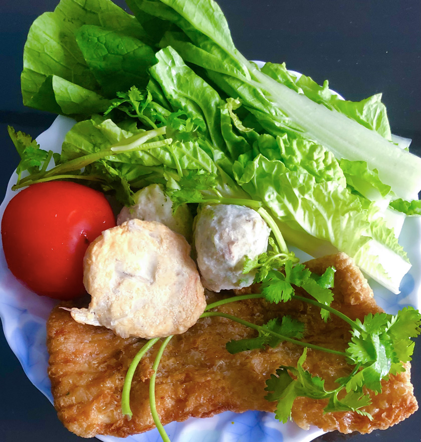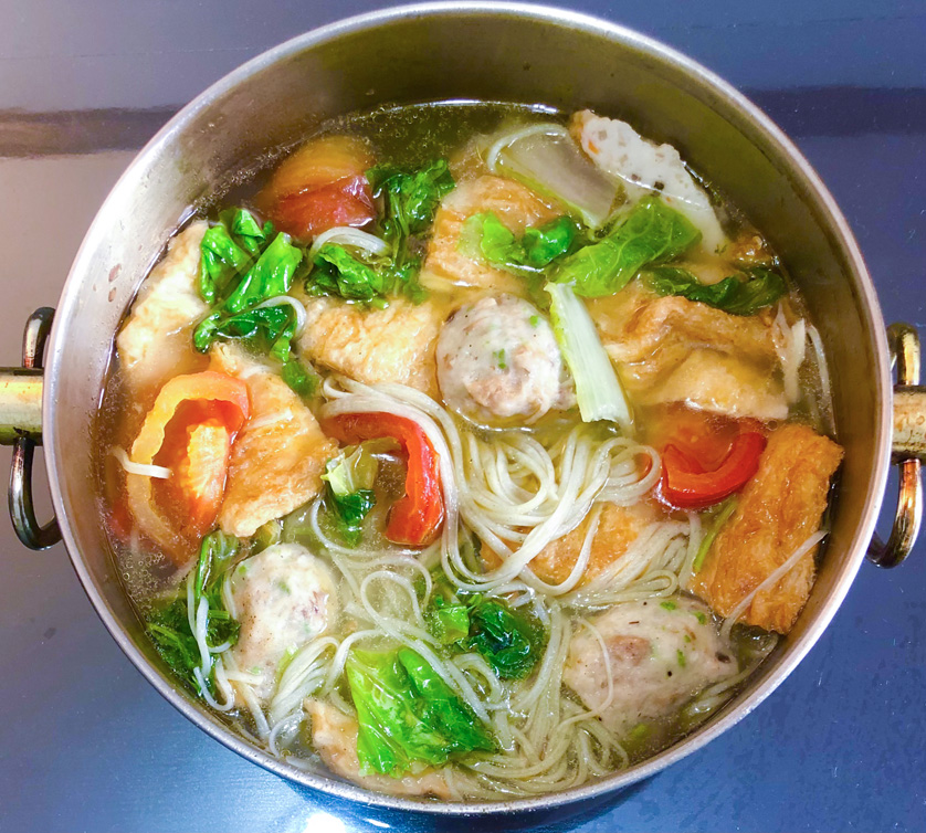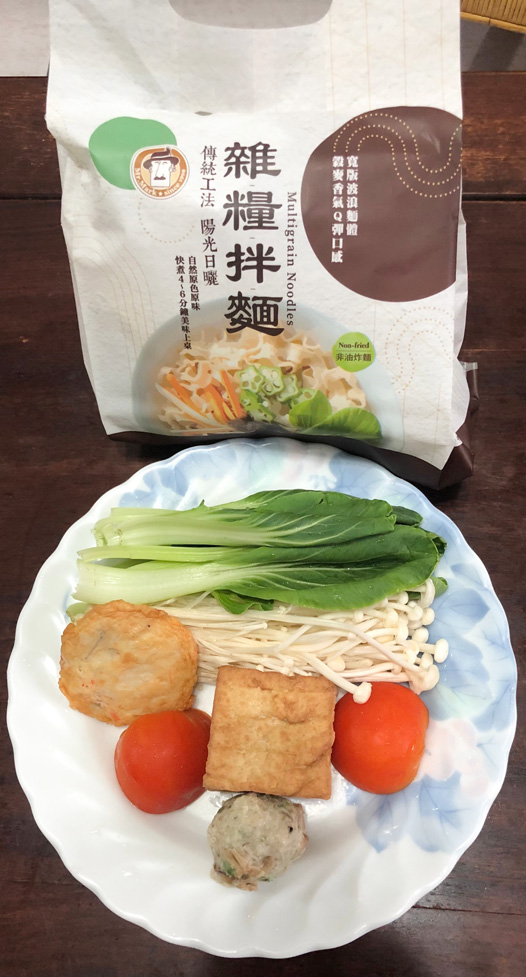 材料:雜糧麵、青菜、番茄、油豆腐、天婦羅、素菜丸、金針菇、沙茶、豆瓣醬、鹽、香油。