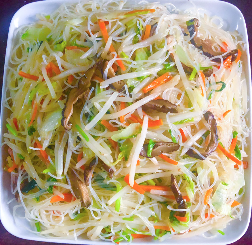 作法:先煮一鍋開水將米粉放下,加點食用油把米粉煮軟撈起備用。豆芽摘去頭尾泡在水中加點醋備用,香菇紅蘿蔔切絲,炒鍋放油下香菇紅蘿蔔炒香+小白菜+鹽+少許素毫油拌炒+一碗水煮滾+米粉+豆芽+胡椒鹽+素食烏醋拌炒入味關小火+香油+香菜拌勻即可。