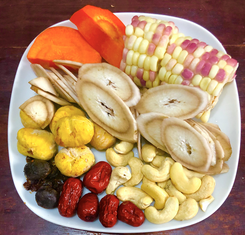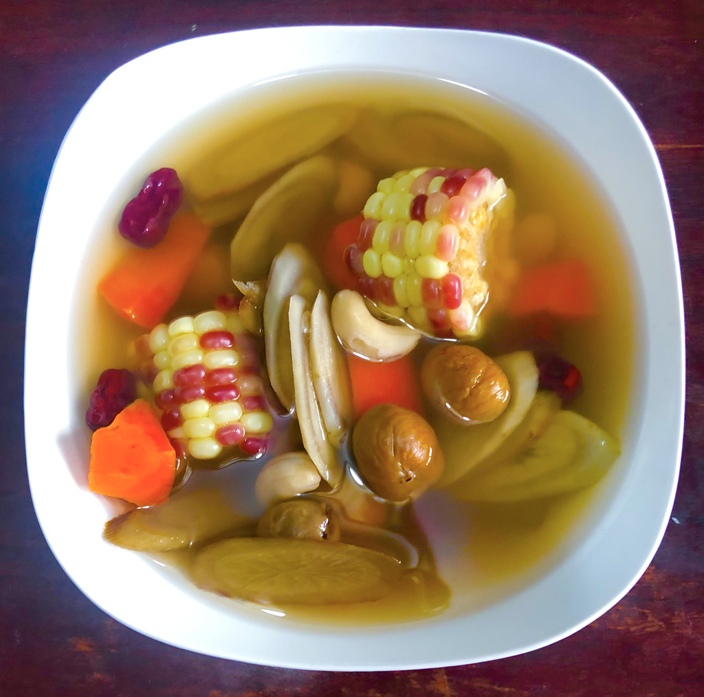 材料:牛蒡、玉米、紅蘿蔔、粟子、腰果、紅棗、桂圓乾。