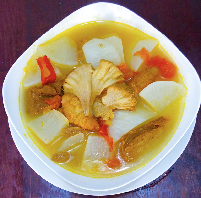 作法:白蘿蔔去皮切滾刀,薑切片番茄切片炒,鍋內放少許油炒薑+番茄炒+白蘿蔔+水煮滾+猴頭菇+皮絲燉煮至蘿蔔熟軟+鹽+胡椒粉即可。