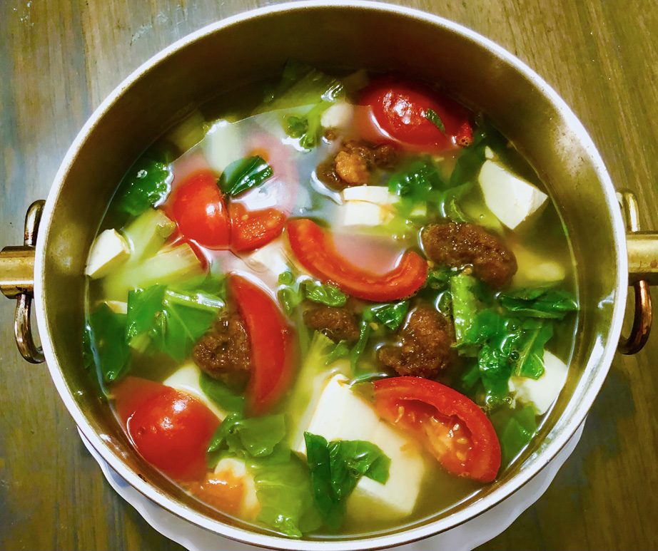 作法:番茄切片,豆腐切小方塊,小白菜切小段,先將蕃茄下鍋炒香+水+豆腐煮滾+白菜+素排骨+鹽煮入味即可。