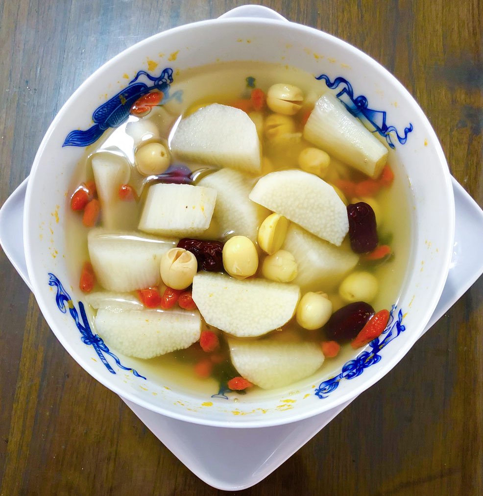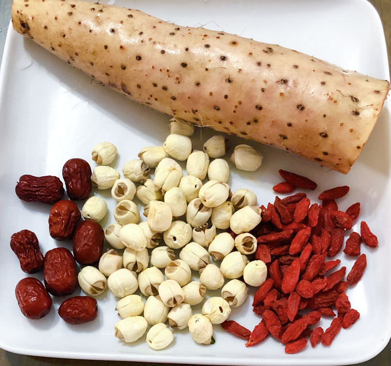 作法:先將山藥刮去皮,切成方塊泡水以防氧化,蓮子、紅棗、枸杞子洗淨,鍋內放火,先將蓮子、紅棗放入鍋煮滾,再將山藥、枸杞子加入一起煮熟+胡椒鹽即可關火。