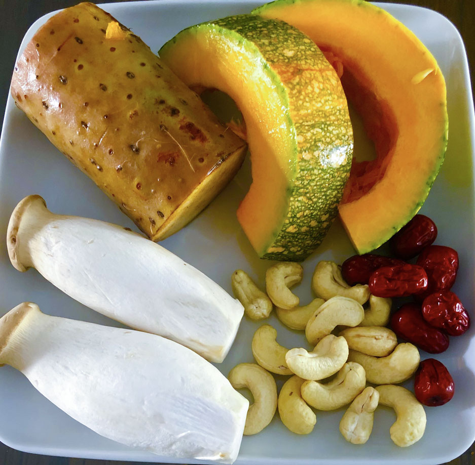 材料:山藥、南瓜、腰果、紅棗、杏鮑菇。