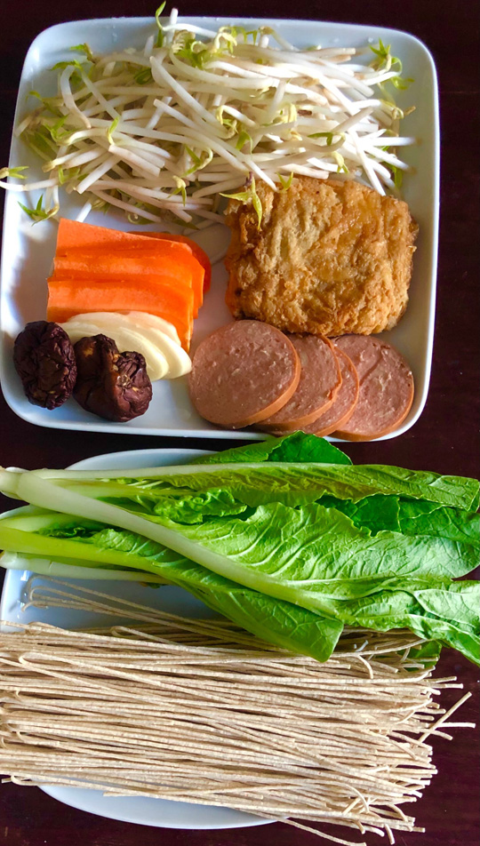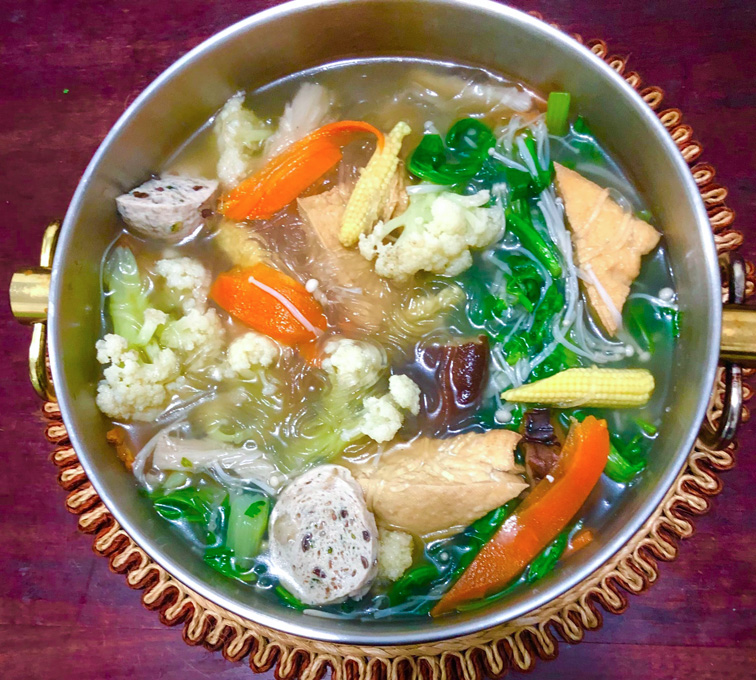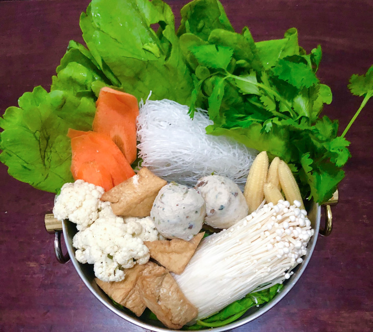 材料:油豆腐、粉絲、素丸子、白花椰菜、香菇、金針菇、玉米筍、紅蘿蔔、茼蒿、香菜、胡椒鹽。調味料隨個人喜歡放。