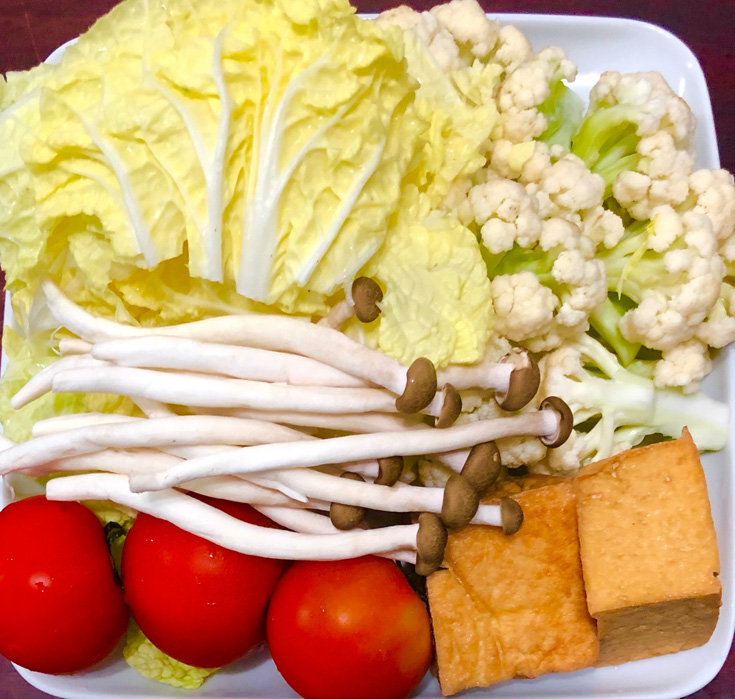 材料:豆腐、馬鈴薯、番茄、櫛瓜、菇、小白菜、味噌、青辣椒、甜不辣、素丸子。