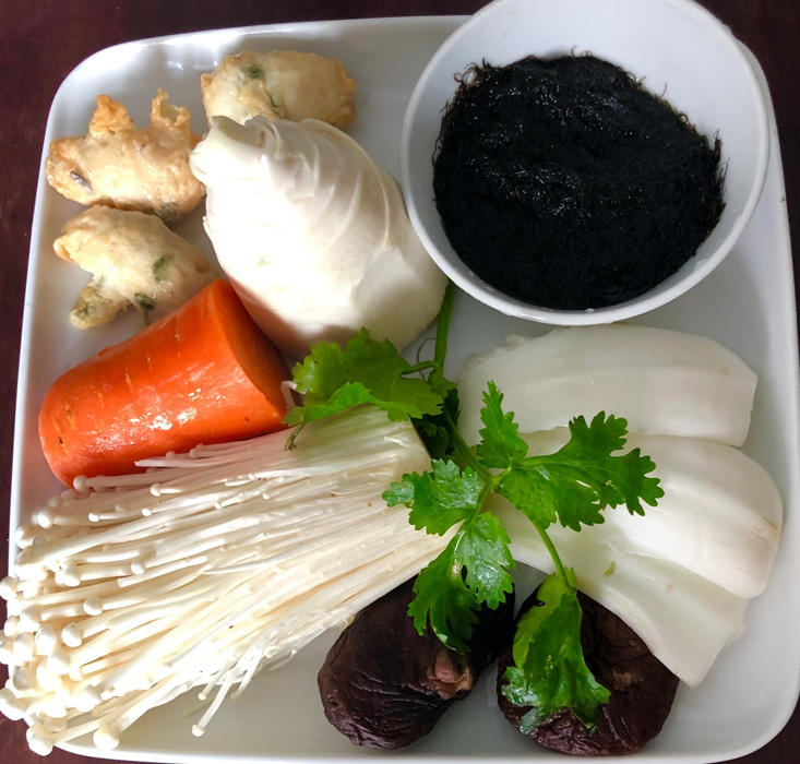 材料:髪菜、筍、金針菇、紅蘿蔔、香菇、白菜梗、甜不辣、素食烏醋、胡椒粉、芡粉、香油。